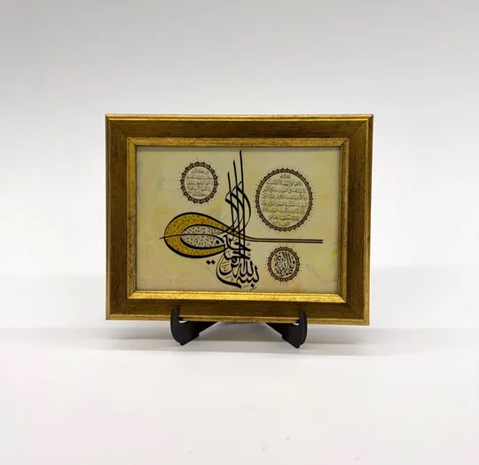 Hat sanatının zarif örneklerinden biri olarak, besmele ve Kur’an-ı Kerim’in en faziletli ayeti olan Ayetel Kürsi’yi Osmanlı tuğrası ile birlikte sunar. Manevi koruma niyetiyle evlerde sıkça tercih edilen bu eser, yüksek kalitede baskı ile hazırlanmıştır. Bu eser teliflidir ve sanatçıya ait özgün bir çalışmadır.